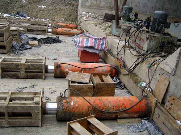 頂管機在液壓千斤頂助力下頂進時停止挖土,傳力柱上和兩
